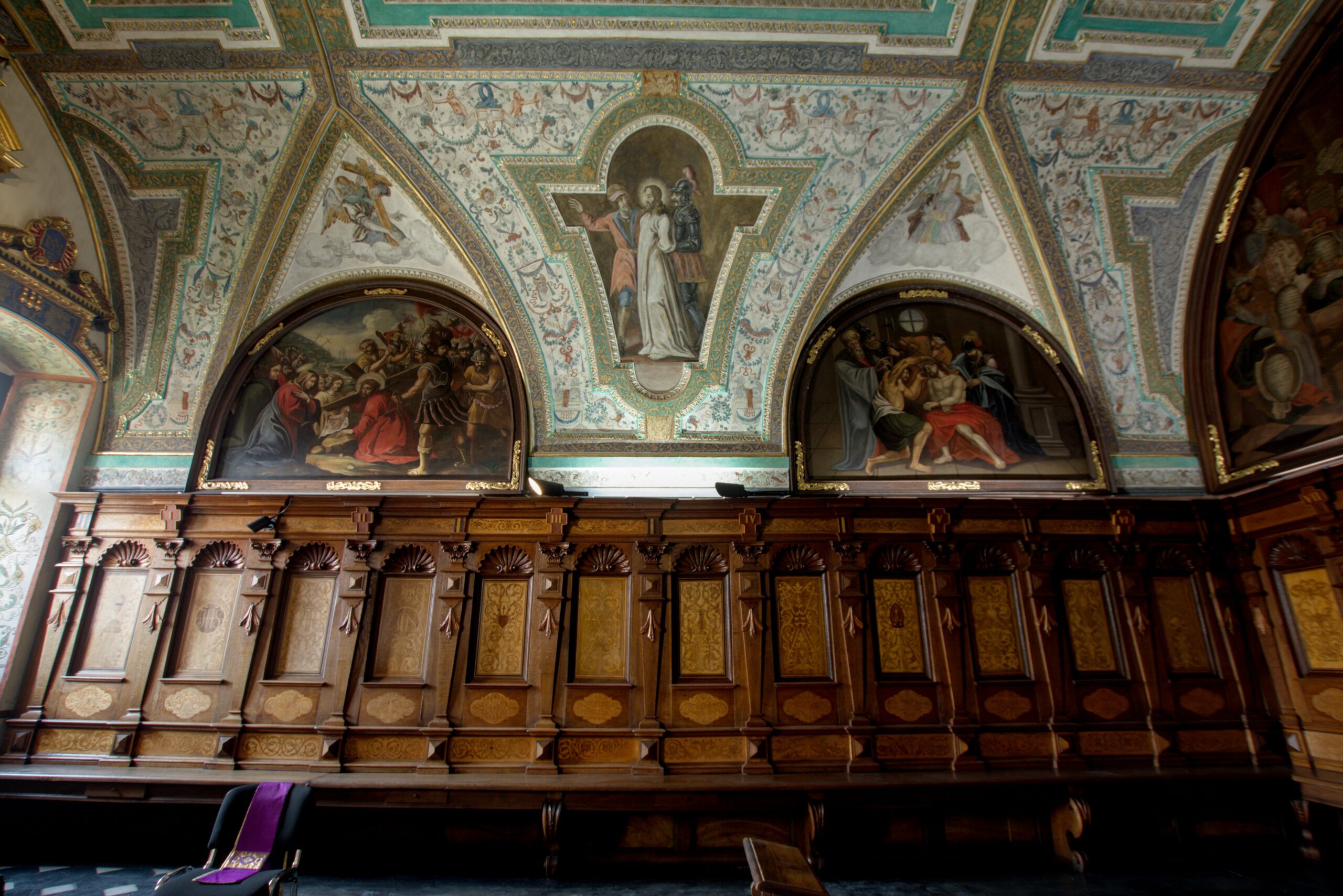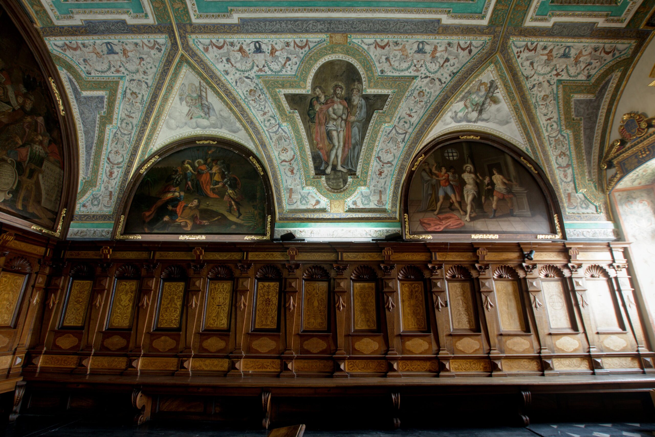 Ściany kapitularza powyżej stalli wypełniają malarskie przedstawienia męki Chrystusa. Ich autorem był krakowski artysta barokowy Jan Koym. Sceny pasyjne namalowane są wyjątkowo sugestywnie, a kolorystyka obrazów bogata i świeża. Tematyka cyklu jest ściśle związana z drogą krzyżową, której stacje są wyznaczone wzdłuż stalli. Cykl rozpoczyna malunek w centralnej części sklepienia; to Jezus w ogrodzie oliwnym, któremu anioł podaje z nieba kielich męczeństwa. Poniżej pokazano kolejne epizody drogi krzyżowej.