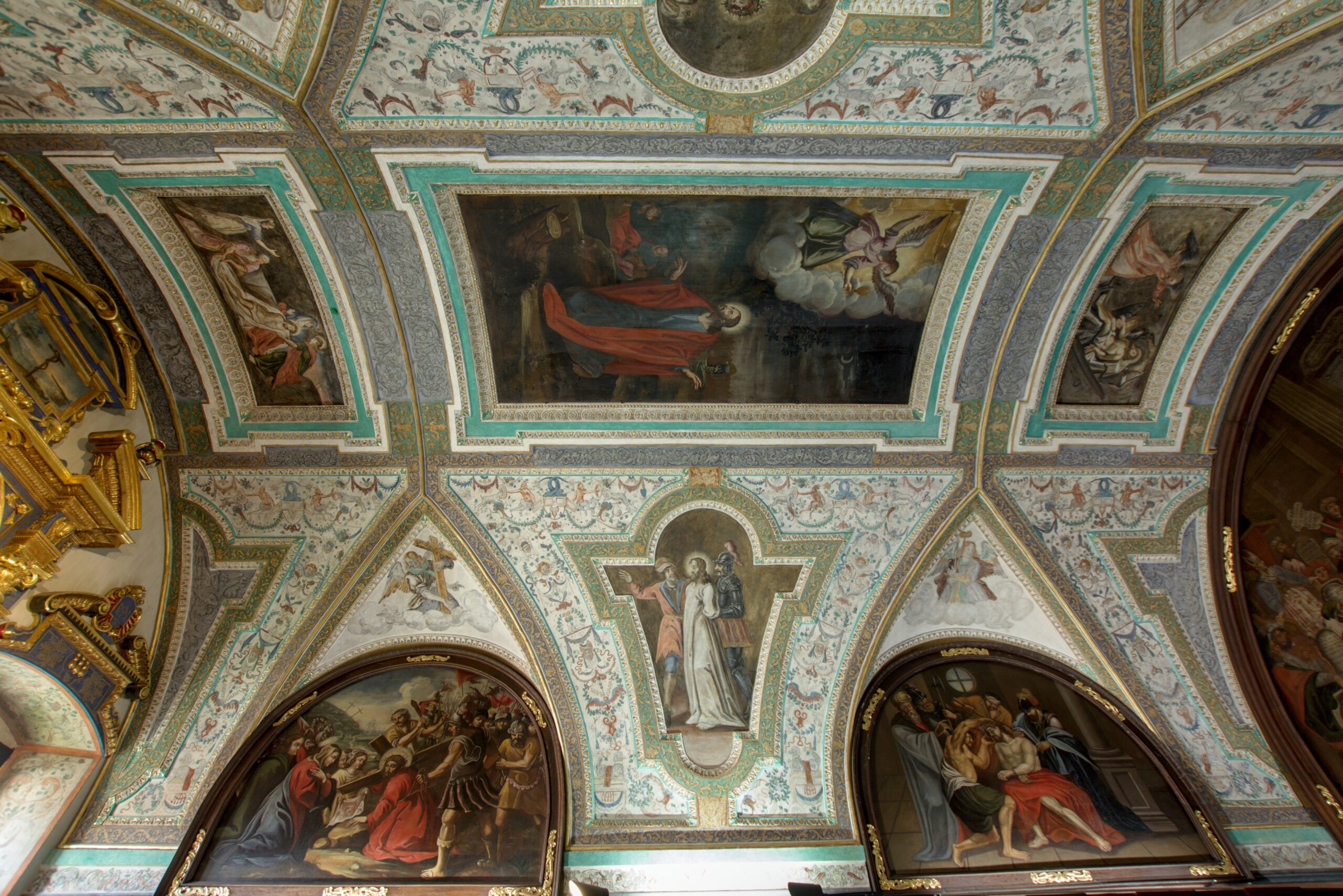 Najciekawszym obrazem cyklu jest „Jezus w Sanhedrynie” namalowany nad wejściem w formie półokręgu. To wizualizacja sądu nad Chrystusem. Odzianego w tunikę podsądnego otaczają Kajfasz, Piłat i członkowie Wysokiej Rady Żydowskiej. Każdy z nich ma przy sobie tablicę z wypisanym tekstem oskarżenia przeciw Jezusowi.