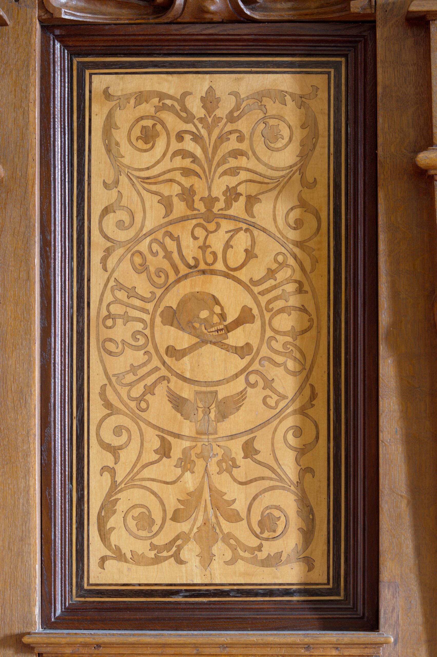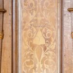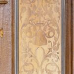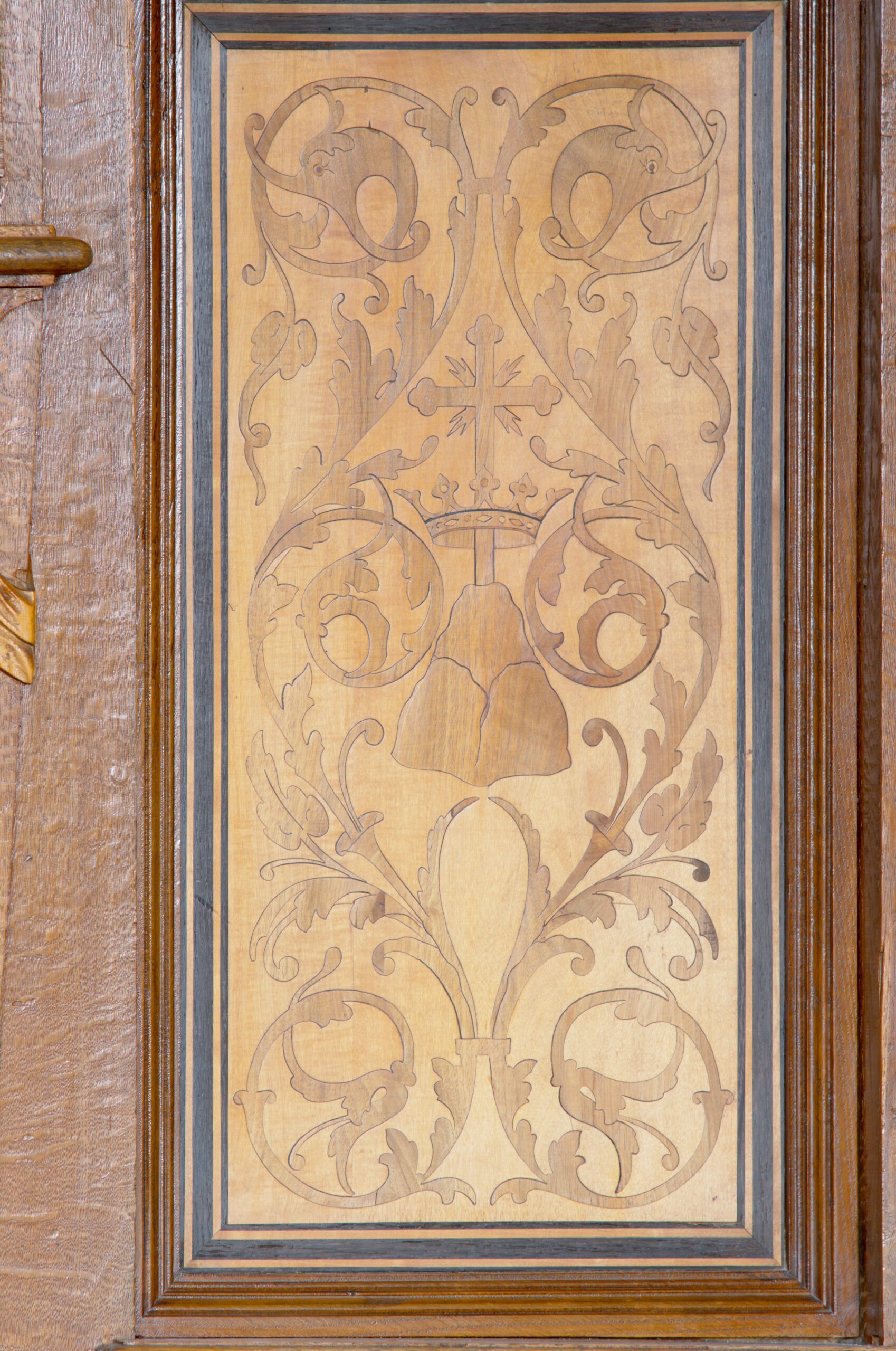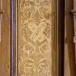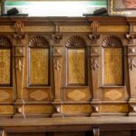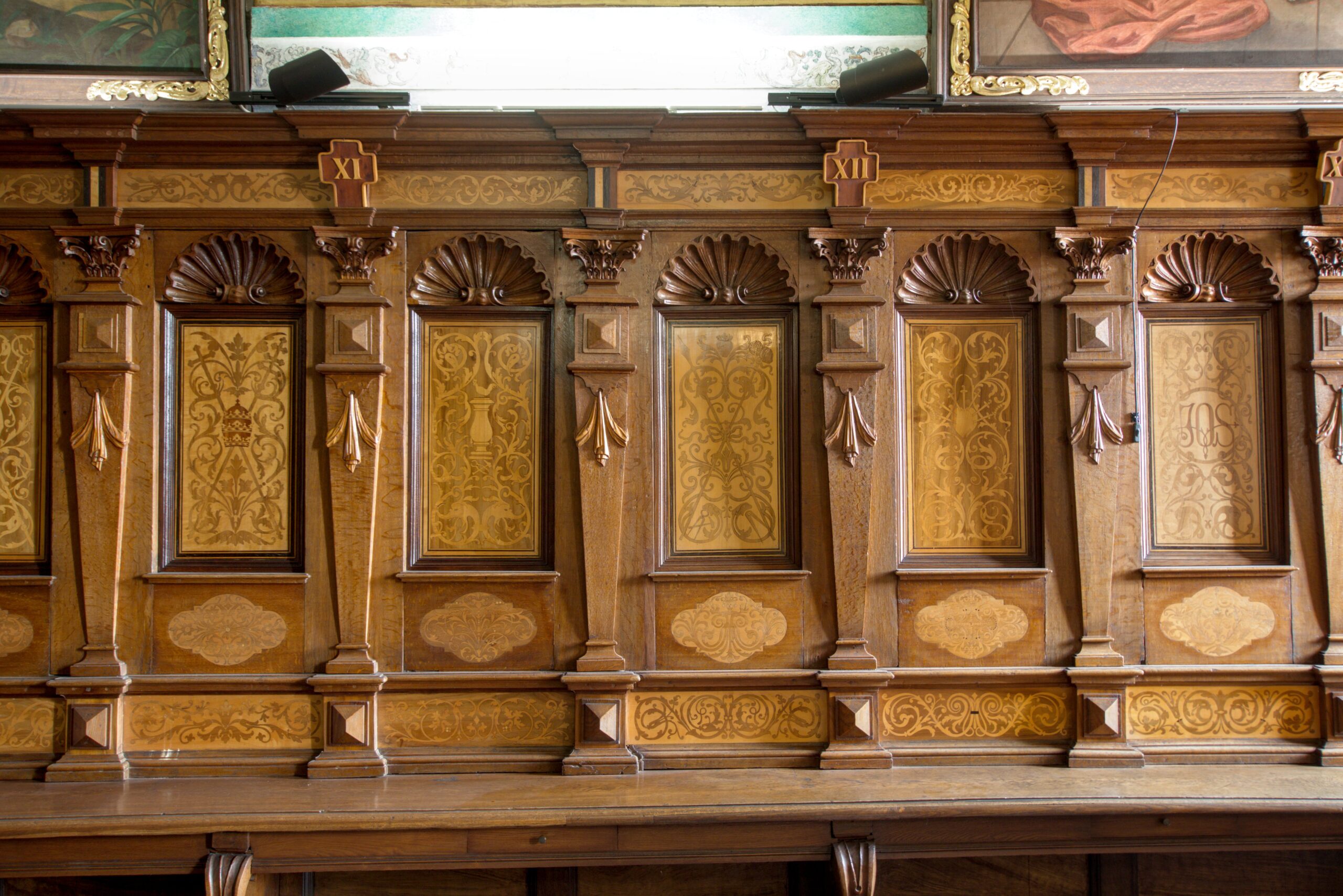 W ciąg stalli włączona jest droga krzyżowa, której stacjom odpowiadają malunki na ścianach powyżej.