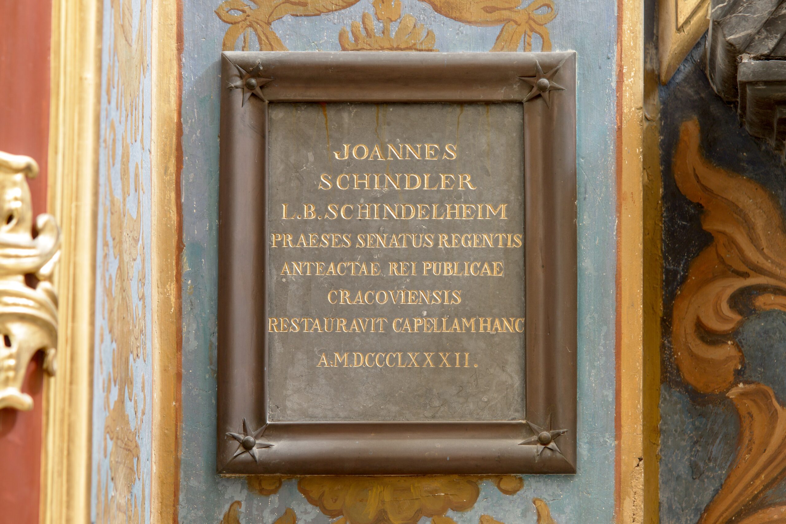 Skromne epitafium upamiętniające Jana Schindlera. Była to postać bardzo zasłużona dla Krakowa (choć także kontrowersyjna z powodu współpracy z Austriakami), a szczególnie dla klasztoru na Bielanach. Odnowił on klasztorną studnię i dom gościnny, nazwany na jego pamiątkę Schindlerówką, ufundował jedną z kaplic w tutejszym kościele i podarował kamedułom swój księgozbiór. Podczas pracy w senacie Krakowa uporządkował finanse miasta,  a także zajął się m.in. rozbudową kanalizacji, brukowaniem ulic, odnową wielu budynków i zapoczątkowaniem budowy mostu Dębnickiego. Po śmierci pochowany został na krakowskich Bielanach.