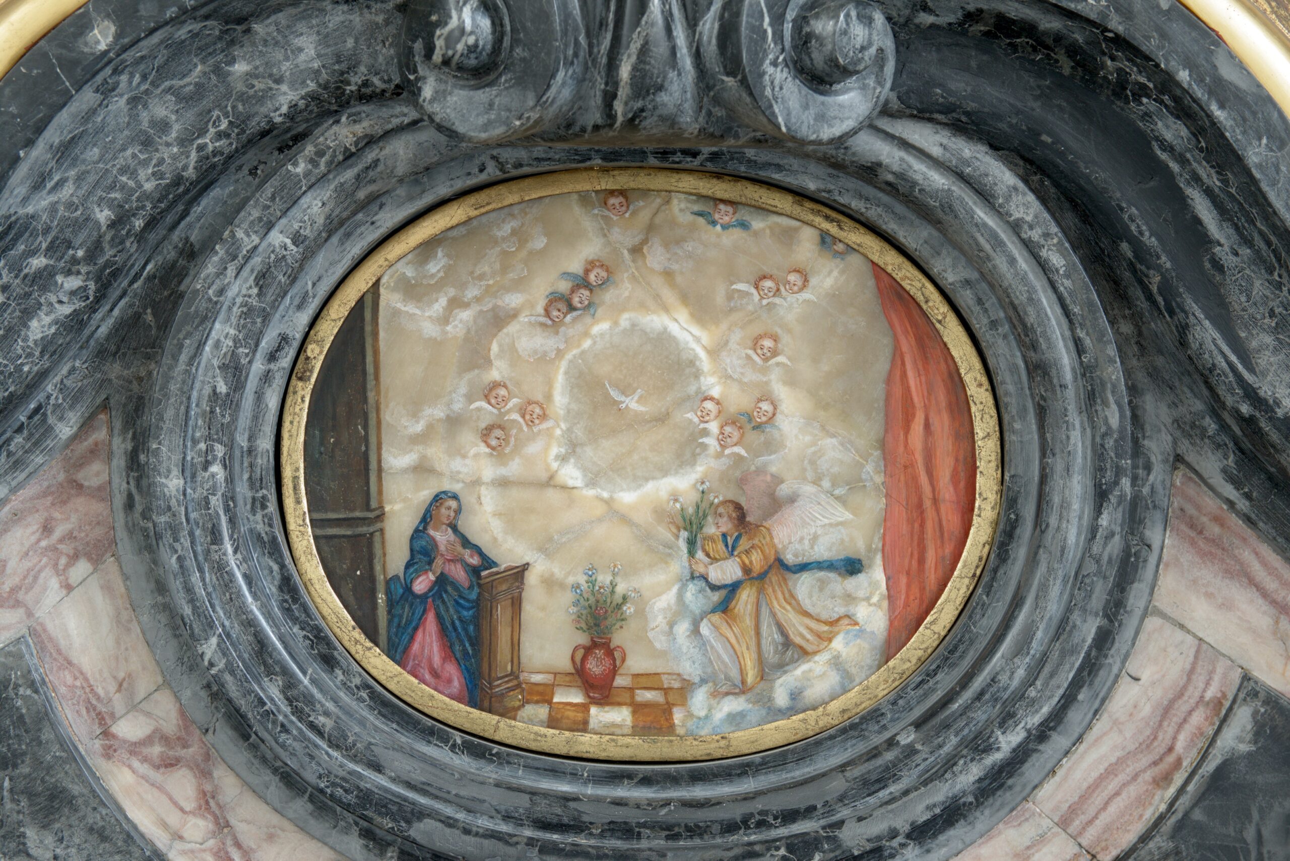 Niewielki medalion z alabastru o eliptycznym kształcie umieszczony w ołtarzu, poniżej obrazu ze św. Sebastianem. Przedstawia scenę Zwiastowania NMP.