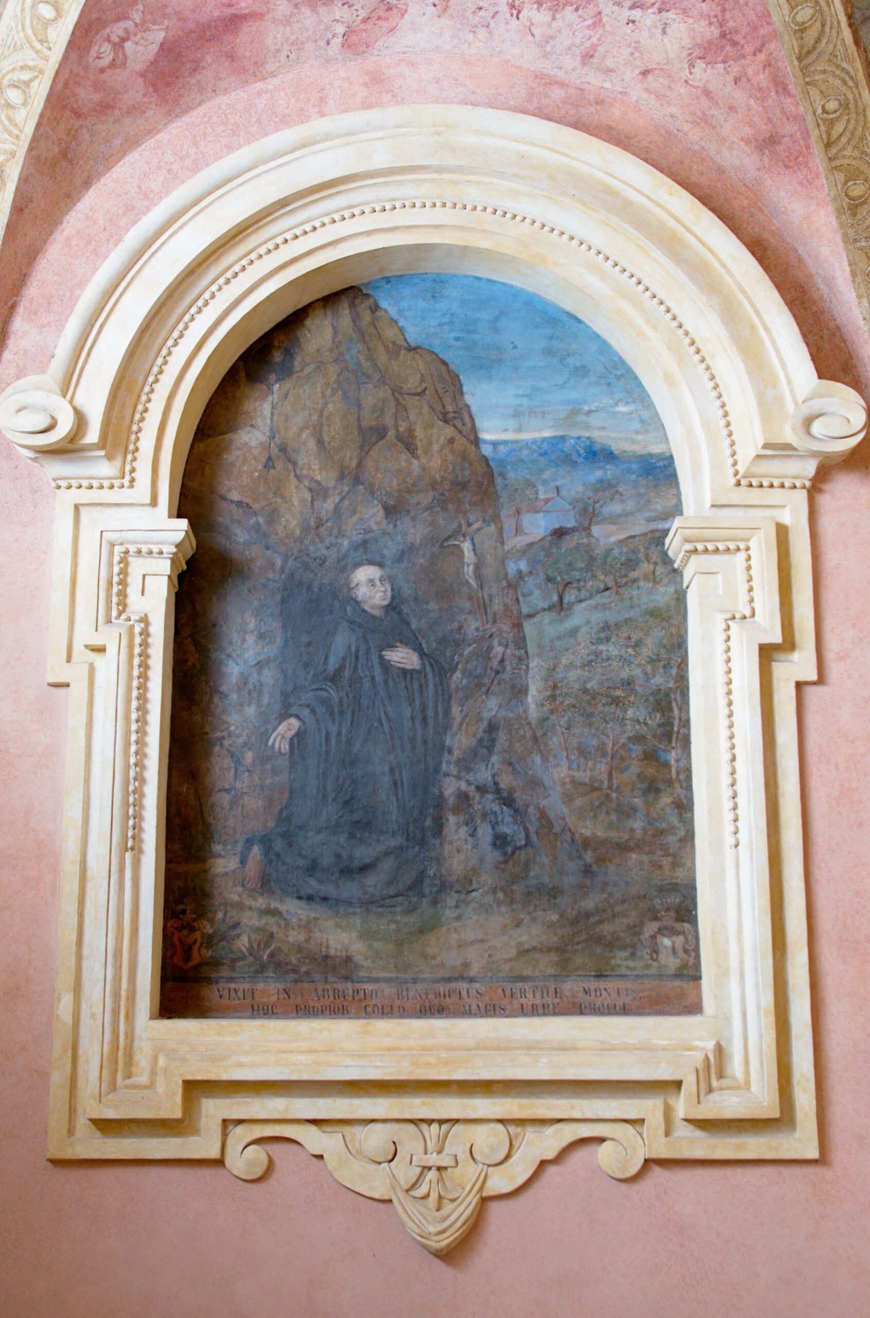 Wyobrażenie świętego Benedykta zostało namalowane bezpośrednio na ścianie furty w stiukowych obramieniach. Święty Benedykt z Nursii były mnichem eremitą, autorem reguły benedyktyńskiej (stosowanej także przez kamedułów). Klęczący święty ukazany jest na tle krajobrazu. W tle, na skale widać krzyż. W dolnych rogach widzimy tarcze herbowe fundatorów klasztoru: Mikołaja Wolskiego i Sebastiana Lubomirskiego.
