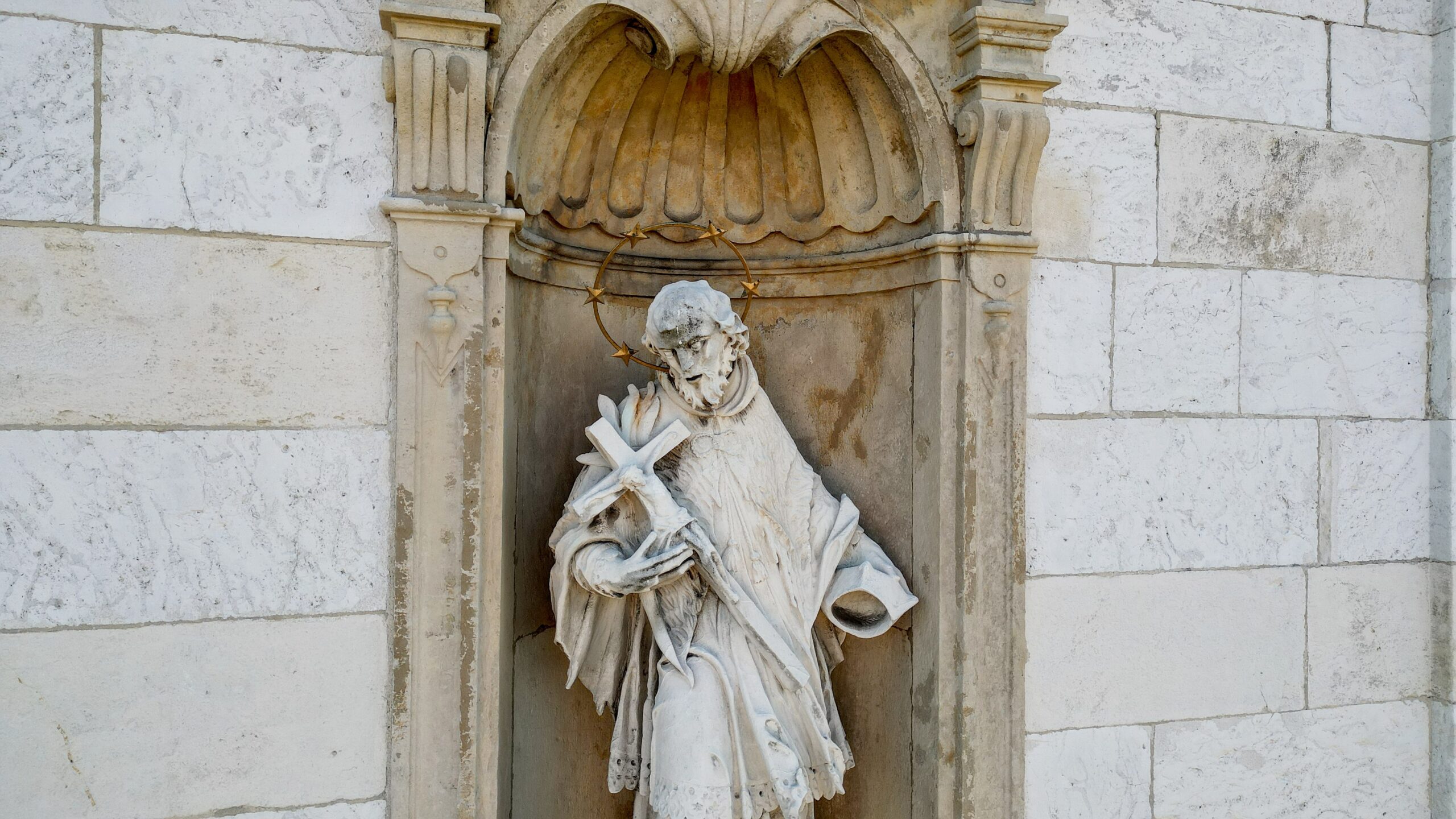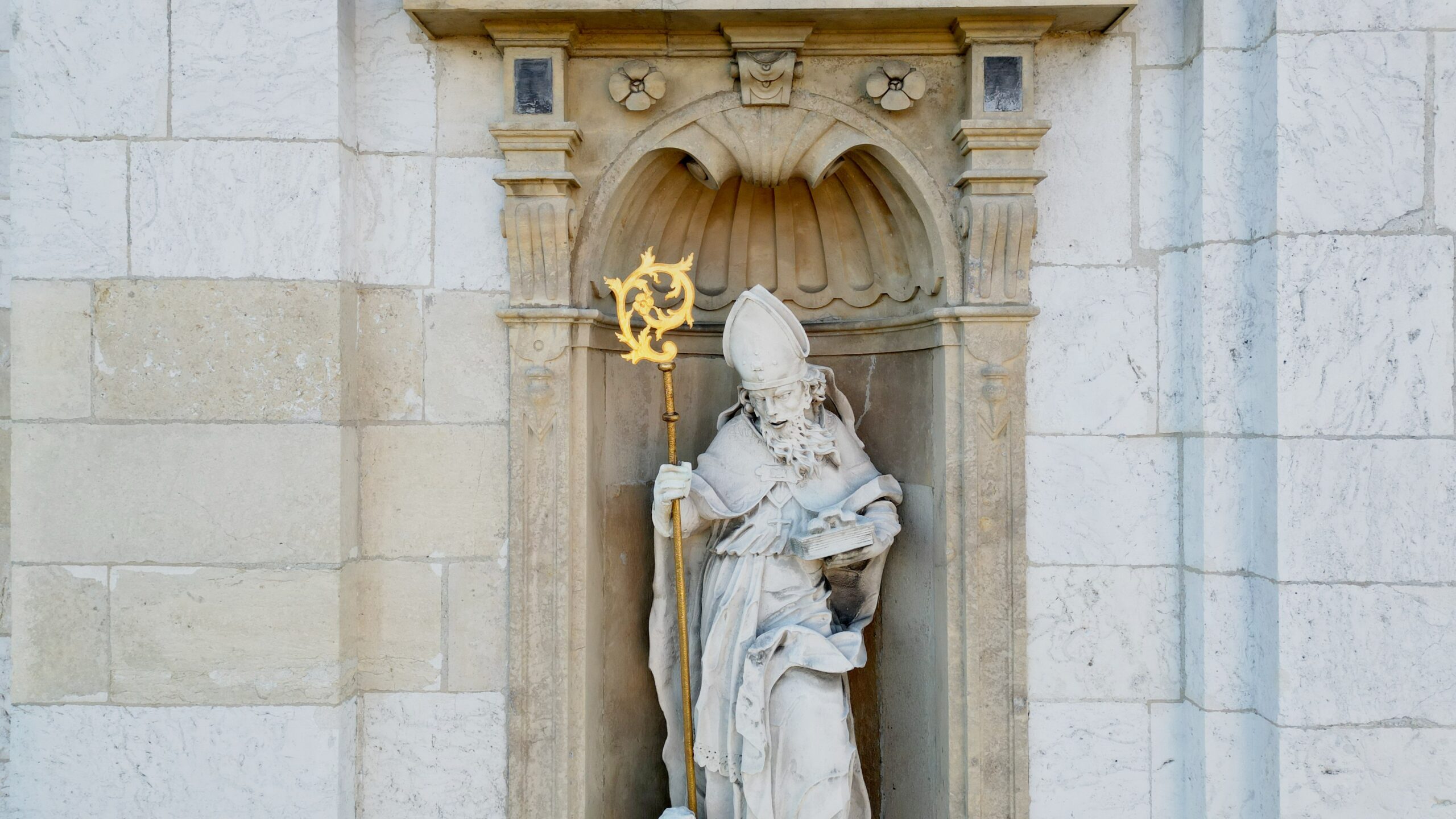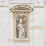 Elewację bielańskiej świątyni ozdabia siedem rzeźb naturalnej wielkości wykonanych z piaskowca. Na samym szczycie – posąg Matki Boskiej, której poświęcony jest kościół.