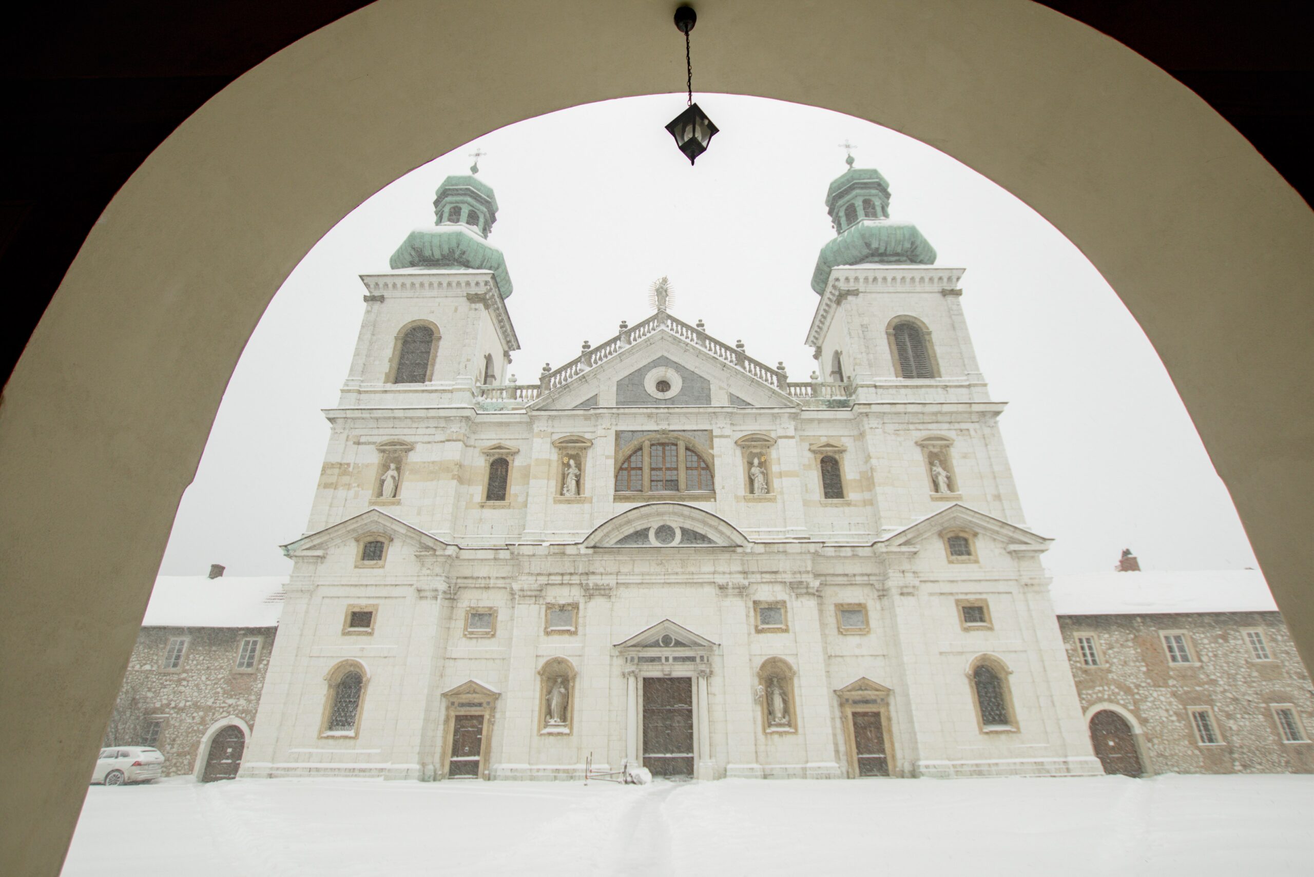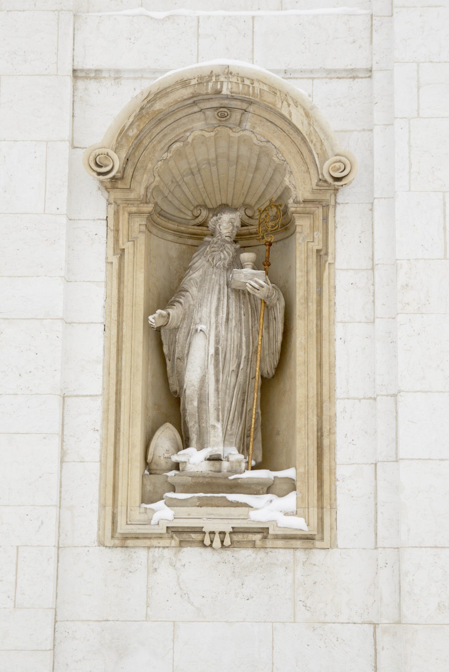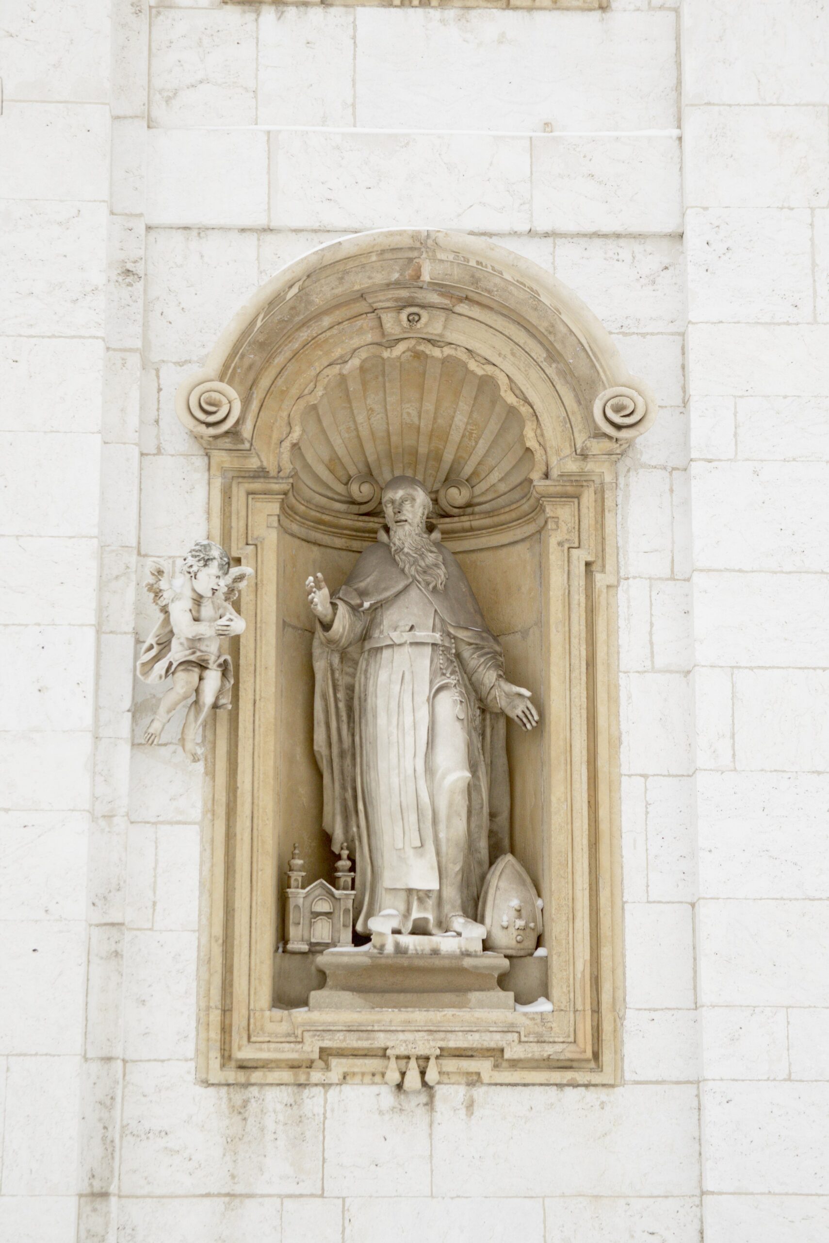 Pozostałe sześć figur umieszczono we wnękach poniżej. Przedstawiają one świętych związanych z kamedulską tradycją i szczególnie popularnych w tamtych czasach. W dolnym rzędzie, symetrycznie po obu stronach wejścia, znalazły się obeliski św. Benedykta (po lewej), twórcy reguły, i św. Romualda (po prawej), założyciela zakonu.