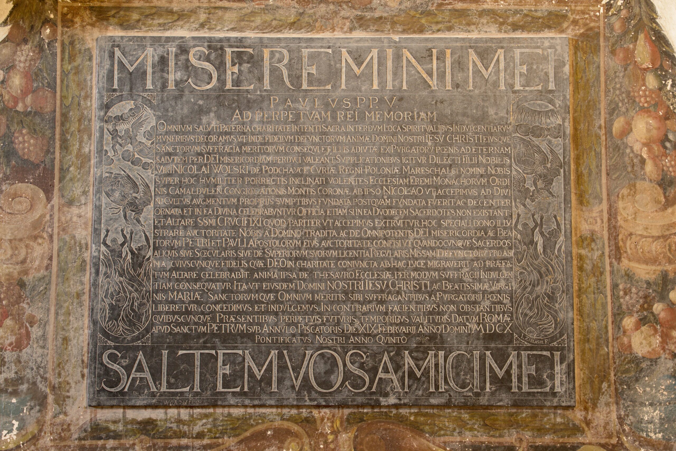 Tablica upamiętnia bullę wydaną dla kamedułów przez papieża Pawła V. W bulli tej papież nadaje kościołowi bielańskiemu i klasztorowi odpusty, a także zezwala na kobietom na wejście do kościoła 12 razy w roku, w specjalnie wyznaczone dni świąteczne.