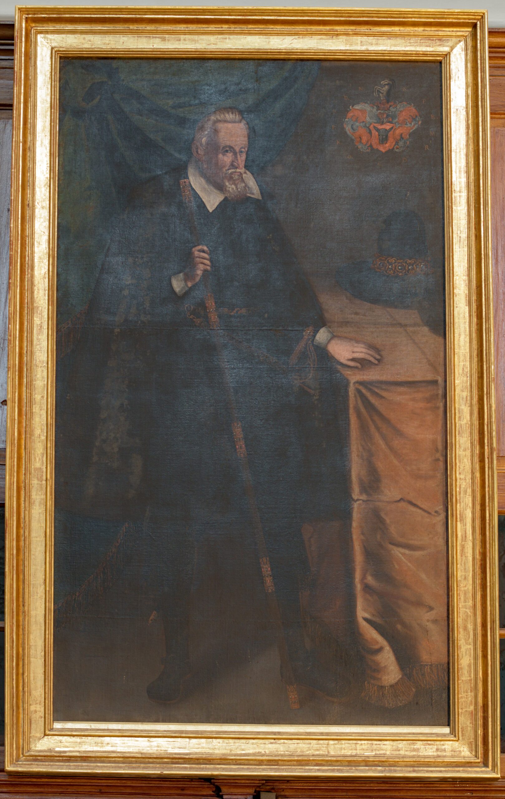 The painting, by Venante of Subiaco from the first half of the 17th century, depicts the monastery’s founder, Grand Marshal of the Crown Nicholas Wolski. Wolski, dressed in a black robe, holds a marshal’s staff in his right hand. On a cloth-covered table there is a black hat decorated with gold and pearls. Wolski’s crest, the Half-Cossack, is visible in the upper right corner.