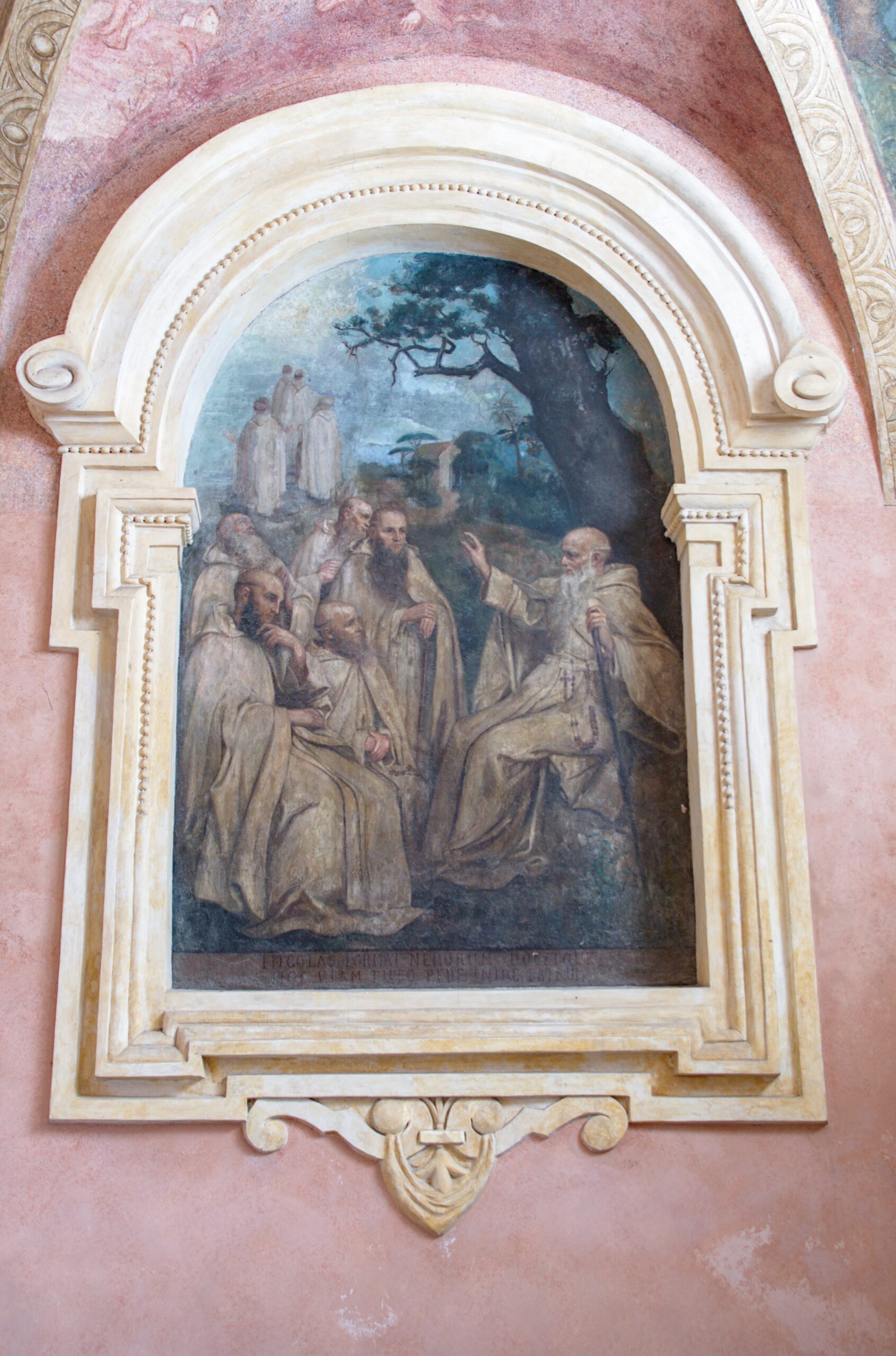 The painting on the wall of the vestibule of the gatehouse has been framed with decorative stucco. St. Romuald, the founder of the Camaldolese order, is shown seated. He is facing a group of five disciples dressed in white Camaldolese habits. The composition of the painting repeats very closely the composition of Andrea Sacchi’s painting, which had been distributed as a print and may have been the inspiration for the Bielany painting. On the left side of the composition we can see a scene referring to the dream of St. Romuald – monks wearing white habits, shown from behind, ascending towards heaven.